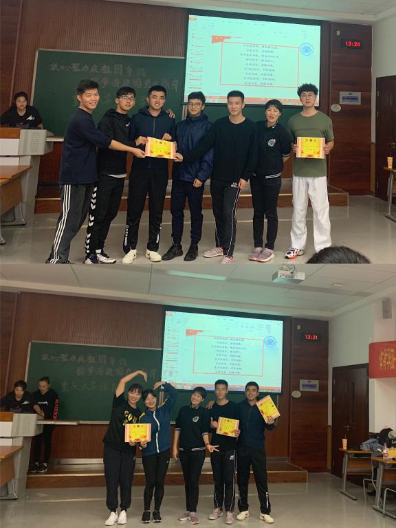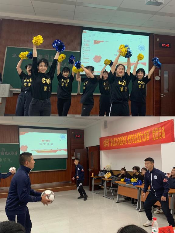 师生对新中国70华诞、重大90年校庆的祝贺以及重大体育人在新时代做有为青年的信心。