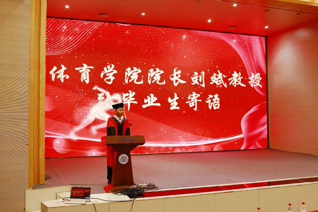 刘斌院长以‘体育强则中国强,国运兴则体育兴’为题向2024届毕业生寄语。他对同学们圆满完成学业,顺利毕业表示祝贺。他表示,2024届的同学们经历了突发疫情的浴火重生,受到了党的二十大胜利召开的伟大指引,是不平凡的一届。刘斌院长寄语同学们要不忘初心,保持匠心,宠辱不惊,继续发扬奋斗、拼搏、超越的体育精神,传承耐劳苦、尚简朴、勤学业、爱国家的重大校训,长风破浪,不断自我超越与蜕变,为中华民族的伟大复兴事业添砖加瓦,贡献力量。