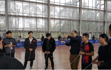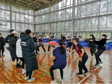 本次素质拓展将2018级学生随机分为两队,以小组为单位开展活动,活动内容主要有“人的进化”、“智传呼啦圈”、“众星捧月”、“新四子棋”四个板块的比赛项目。在活动中每队队员互帮互助、积极沟通,所有人都全身心的投入其中,完成每一项挑战。许定国和李永两位老师也在关键时刻对同学们给予提醒,帮助学生进行总结分析,现场气氛热烈融洽,欢声笑语充满了整个体育馆。