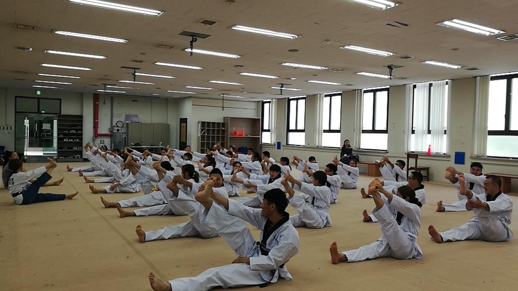 下午三点,研讨班在国际交流学院教室观看庆熙大学国际办学宣传片,参观庆熙大学校园图书馆、体育馆及教学训练馆等场所,同时观看了跆拳道专业学生日常训练与精彩的跆拳道品势表演。随后考察了专业运动员训练基地、跆拳道馆,并与*Blh漫画