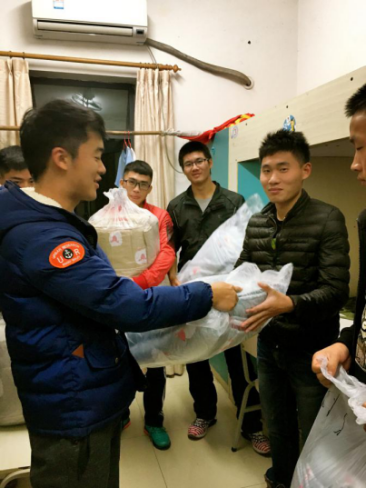 16级辅导员钱驷强通过走访每个宿舍,了解到缺少棉被的同学情况后积极向学院申请并获得批准及支持,周四晚(2016年11月10)钱老师带领两名班委将被子送往松园。