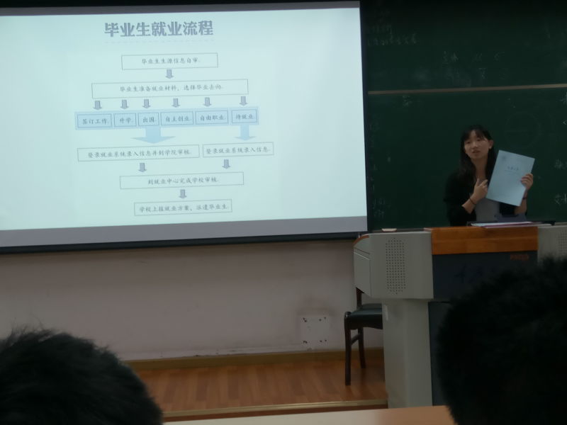 再是由汤婕老师做具体的工作指导,并将她的求职经历或是见闻他人的应聘经验与同学们进行分享,而后细心的为同学们讲解毕业生就业流程,安排一系列毕业生相关的工作。