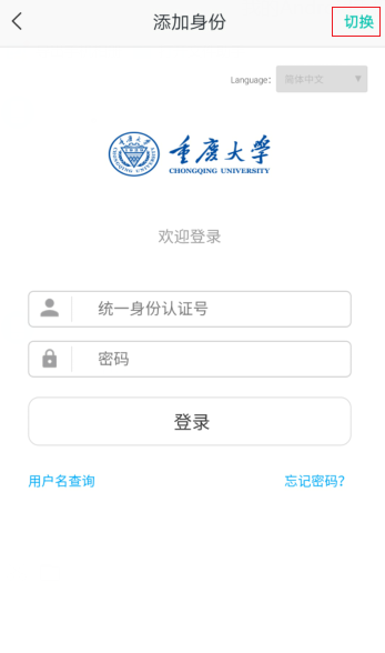 (3)点击右上角的【切换】选择对应的学校名称(Blh漫画 ),已经是Blh漫画 的直接输入账号/密码(学号和统一认证号的密码),点击登录