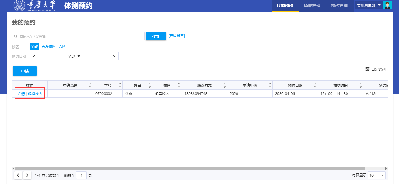 (4)“我的预约”页面增加一条体测预约记录,在体测管理老师没有确认前,可以取消预约,如图所示: