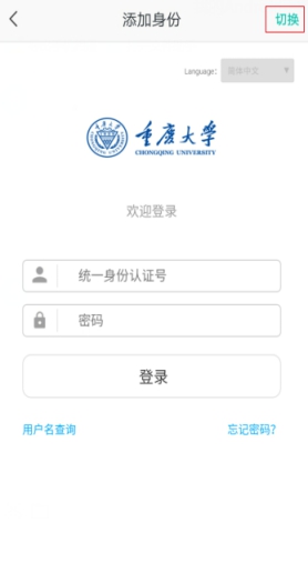 3)点击右上角的【切换】选择对应的学校名称(Blh漫画 ),已经是Blh漫画 的直接输入账号/密码(学号和统一认证号的密码),点击登录