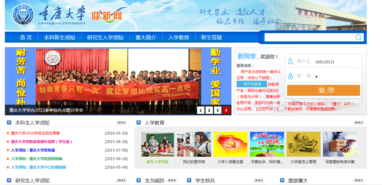 在页面右上角“用户名查询处”查询自己的统一认证号,在“用户名”处输入统一认证号和密码,登录迎新系统