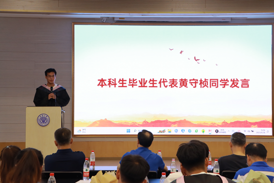 四年之前,黄守桢作为新生代表发言,表达着自己对大学四年的美好期许,四年之后他作为一名即将毕业的本科生,送上了最美好的祝福。祝愿学校蓬勃发展节节高!祝福老师们工作顺利、身体健康!祝福同学们在未来的道路上取得辉煌的成就,铭记学校的教诲,迈向新的征程,用所学知识和技能为社会作出贡献。实现自己的梦想!