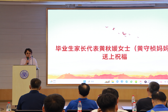 毕业生家长黄秋媛女士代表所有家长向学校表达最真挚的谢意。感谢学校给予孩子们良好的学习成长环境,培养了孩子们积极向上、独立自主的人格和全面地发展的综合素质能力。感谢老师老师用自己的汗水与智慧为孩子们辛勤付出,用心灵的火花照亮了孩子们前行的路。同时,她也代表家长向全体毕业生们送上暖心祝福与美好期望,愿他们在未来的道路上,要勇敢面对挑战,保持积极向上的态度,坚持追求自己的梦想。