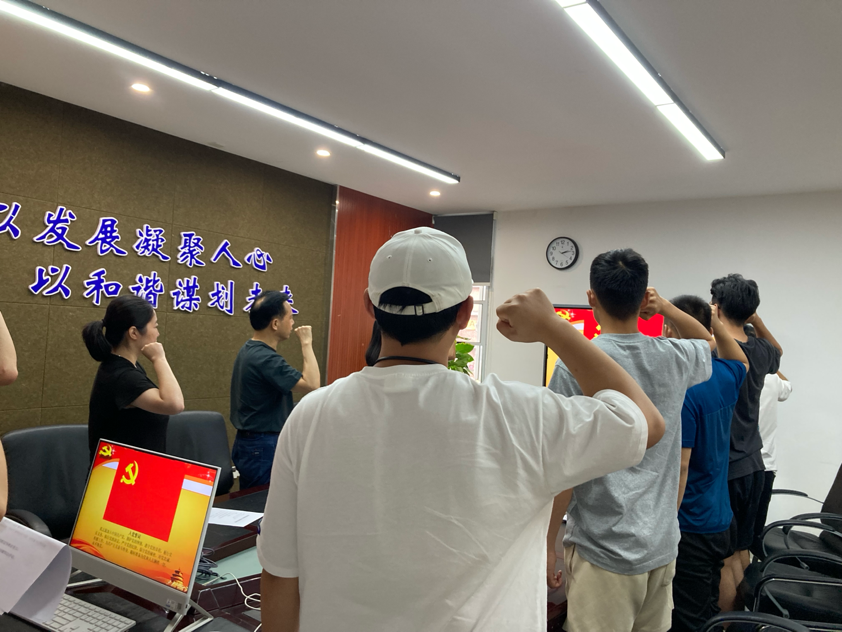 随后,全体党员面向党旗肃立,在领誓人明兴建的带领下,进行入党宣誓,党员们声