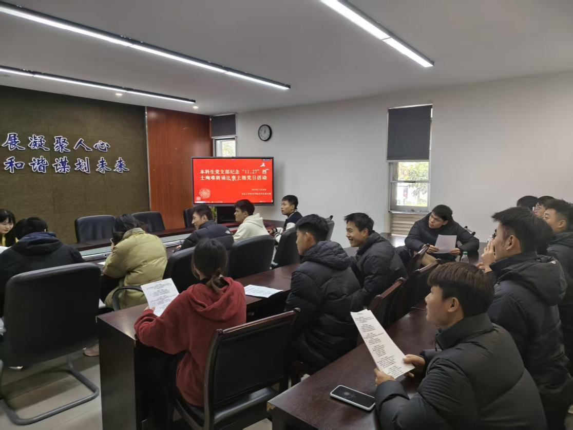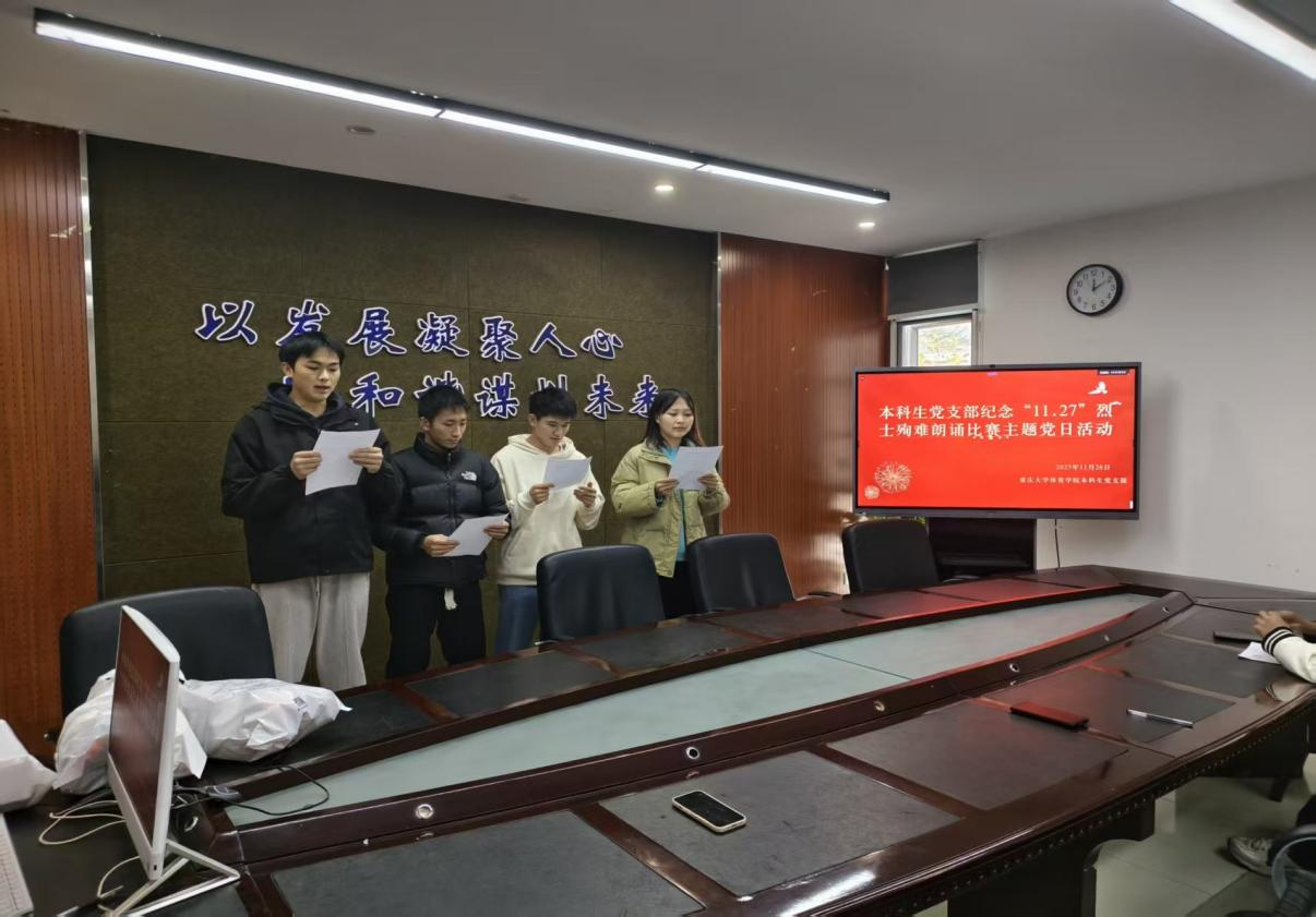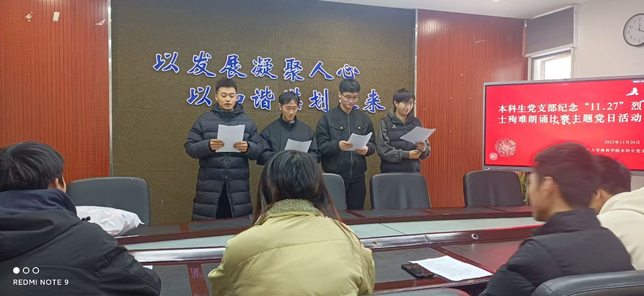 为缅怀革命先烈,传承红色基因,赓续精神血脉,进一步激发青年党员的爱国热情与使命担当,11月26日中午,体育学院本科生党支部在学院211会议室举行了纪念“11.27”烈士殉难朗诵比赛主题党日活动,全体本科生党员参加。