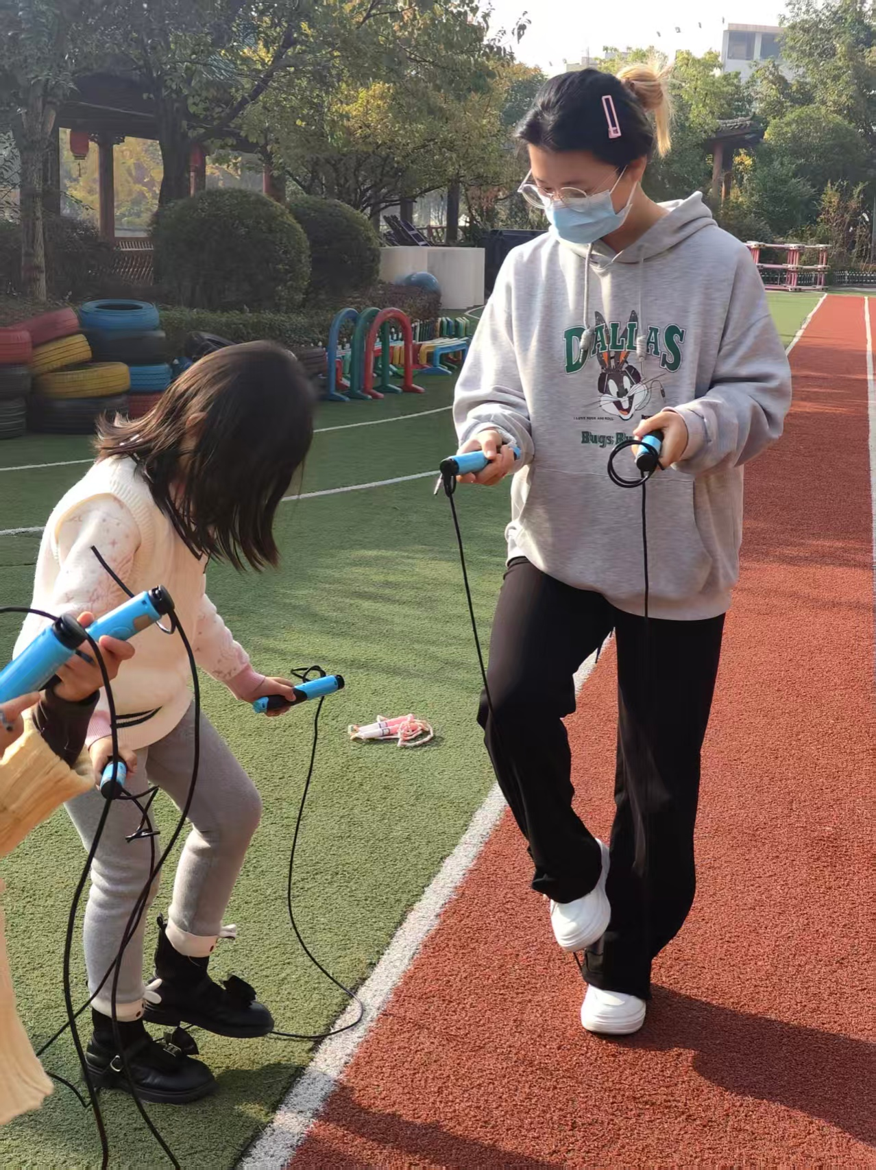 活动现场,研究生党员们充分发挥自身的专业特长,化身“体育教练”与“游戏伙伴”。他们针对学龄前儿童的身心特点,精心设计了趣味盎然的体育活动环节。在“跳绳初体验”环节,党员们耐心地为孩子们讲解并演示跳绳的基本动作,从摇绳、起跳到落地,一步步分解教学。孩子们兴致勃勃,小手努力地挥动着彩色的短绳,虽然动作略显稚嫩,但脸上洋溢着尝试新技能的兴奋与专注。