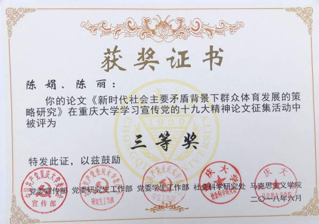 近日在学校宣传部获悉,由Blh漫画 研究生陈娟、陈丽撰写的《新时代社会主要矛盾背景下我国群众体育发展策略研究》在“Blh漫画 学习宣传党的十九大精神论文征集活动”中被评为三等奖,Blh漫画 学报社会科学版(增刊)出版。