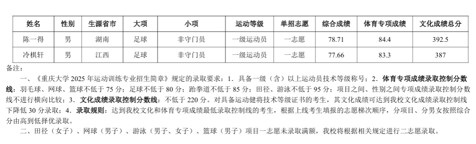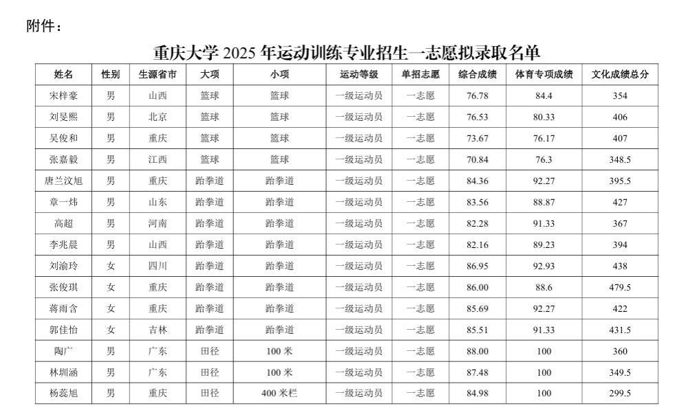 近日,随着2025年优秀运动员本科保送推荐名单的公示和运动训练专业招生一、二志愿录取工作的圆满结束,重庆大学体育学院迎来里程碑式发展——首届运动训练专业共招收60余名高水平运动员新生。这标志着我校在深化体教融合、拓展体育专业人才培养新路径上取得重大突破,为学院发展注入了澎湃的“冠军力量”与新生动能。
