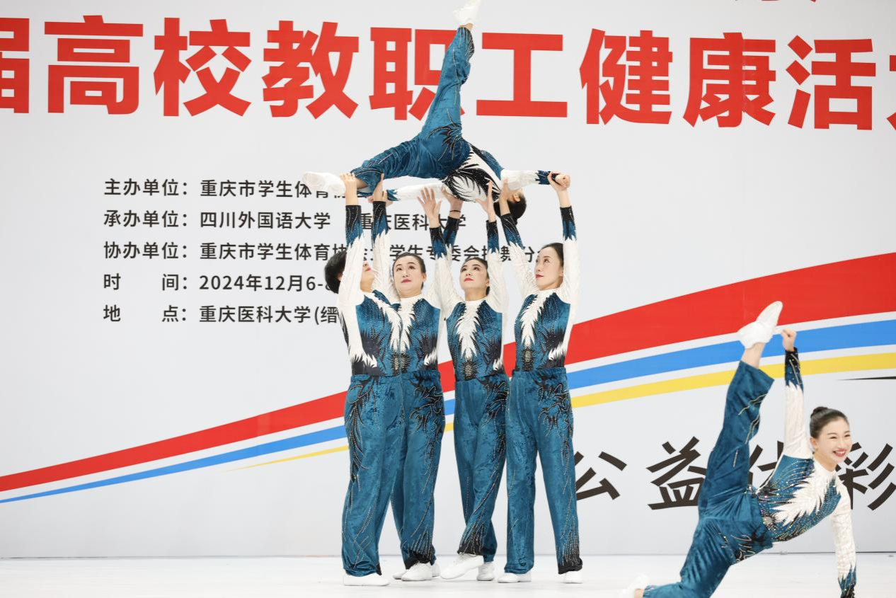 在健身操集体项目中,重庆大学健身操代表队由体育学院曾争、黄丹丹等4名教师,本科生院尚家敏老师,计算机学院袁曦老师组成,动作刚劲有力又不失灵动活泼,以整齐划一的步伐,标准规范的动作和充满激情的表演,传递出积极向上的正能量。