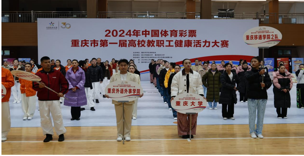 12月7日下午14时,重庆市第一届高校教职工健康活力大赛在重庆医科大学韵搏体育馆顺利举行。本次活动由重庆市学生体育协会主办,四川外国语大学、重庆医科大学承办,重庆市学生体育协会大学生操舞分会协办,重庆市学生体育协会主席胡红,重庆市学生体育协会大学生专委会副主席苟明,重庆市学生体育协会大学生专委会秘书长唐建忠,重庆医科大学体育医学院院长常青等领导嘉宾出席了大赛开幕式。