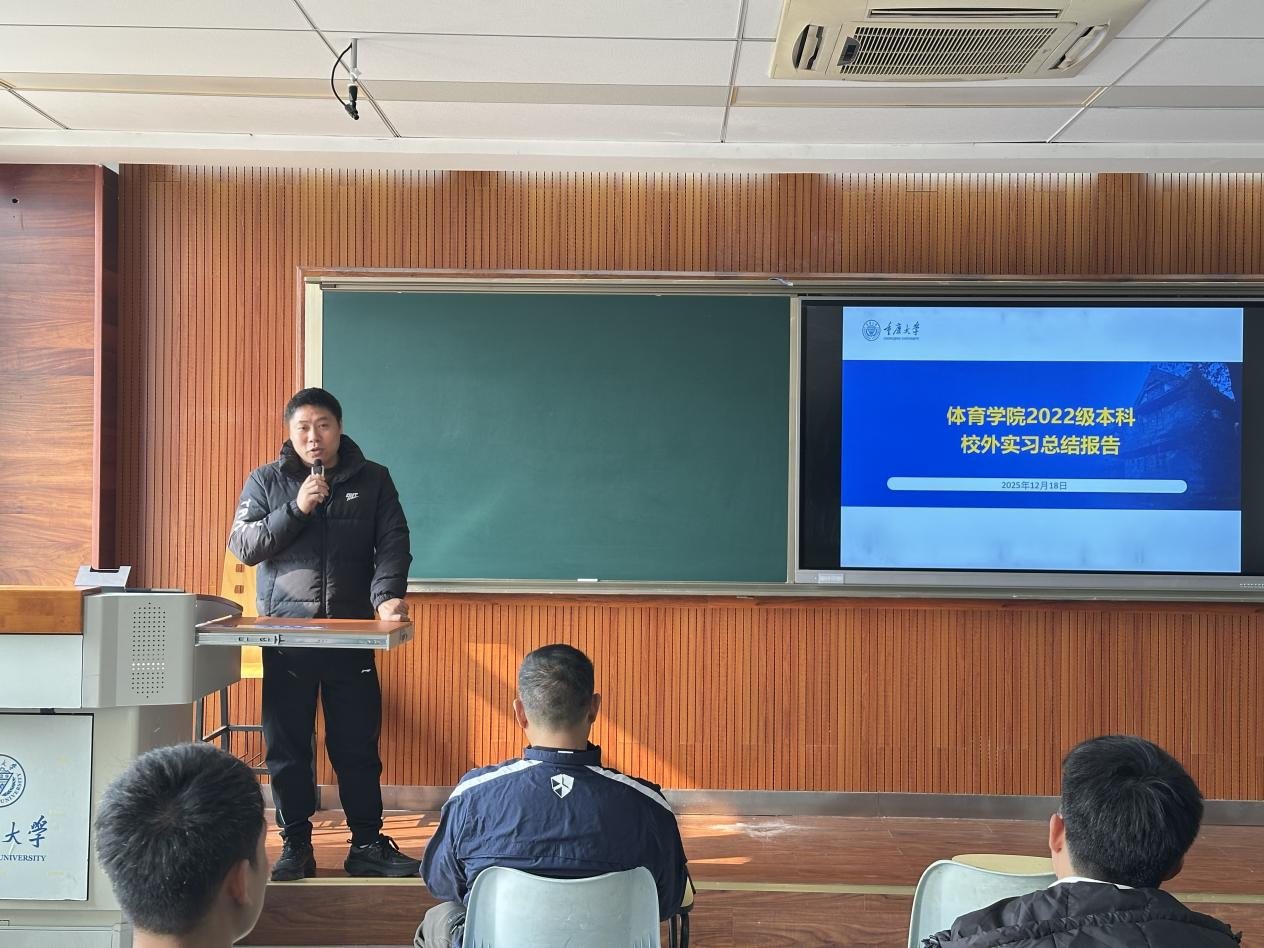 2025年12月18日,重庆大学体育学院于虎溪校园D1417教室召开2022级本科生实习总结会。体育学院副院长向祖兵、专业体育系主任娄方平、副主任李圳程出席会议,会议由娄方平主持,2022级全体本科生参加。