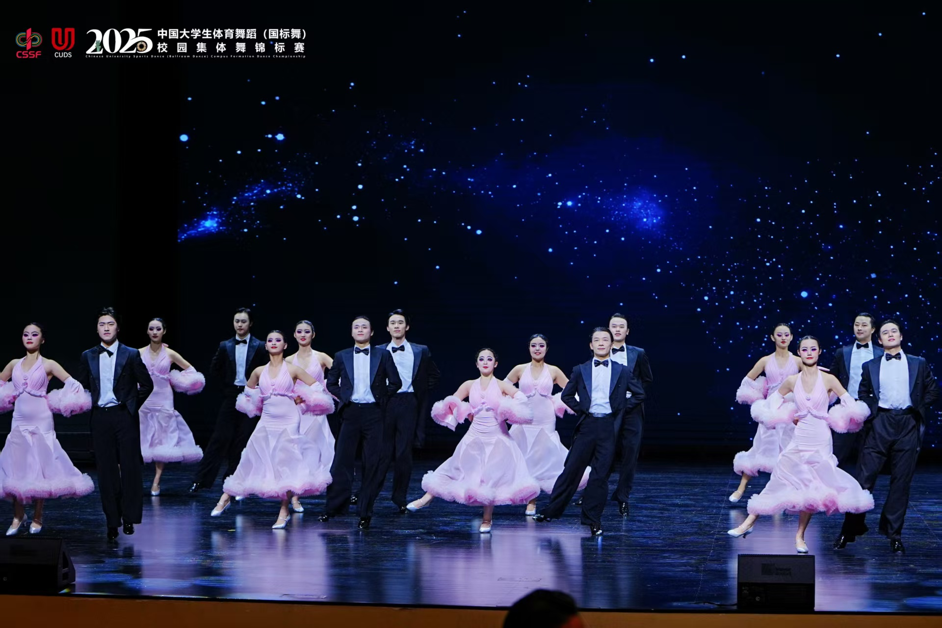 由中国学生体育联合会主办的2025年中国大学生体育舞蹈(国标舞)校园集体舞锦标赛于2025年12月4日至8日在成都市圆满举行。本次赛事设有健身校园舞、竞技队列舞和艺术表演舞三大项目,吸引了来自南京大学、同济大学等95所高校的代表队参赛,近千名运动员同台竞技,呈现了一场艺术与体育交融的青春盛宴。